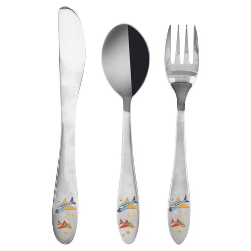 The set is made of high-quality stainless steel decorated with a small element with a colorful airplane motif.