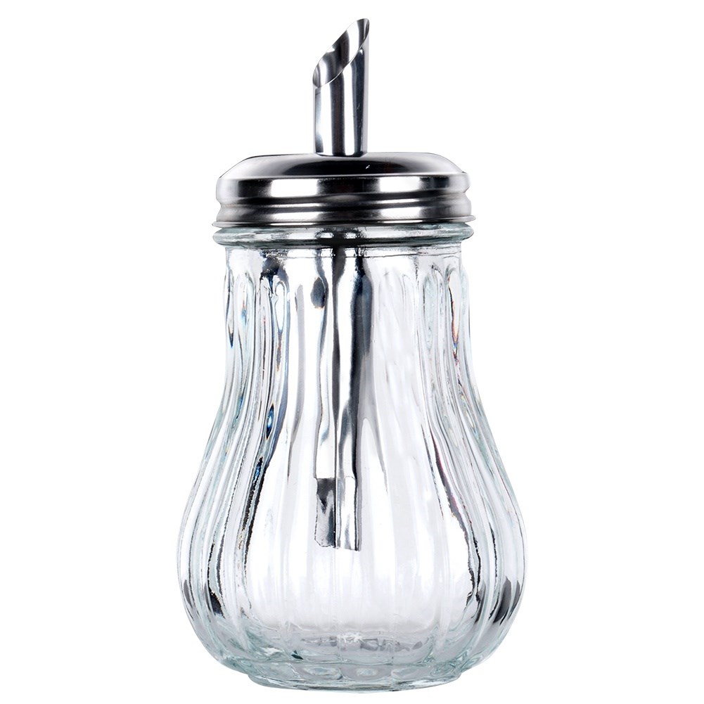 Confectioner with dispenser, perfect for storing and serving sugar. Made of glass and stainless steel. Thanks to it, we will always stick the same amount of sugar.