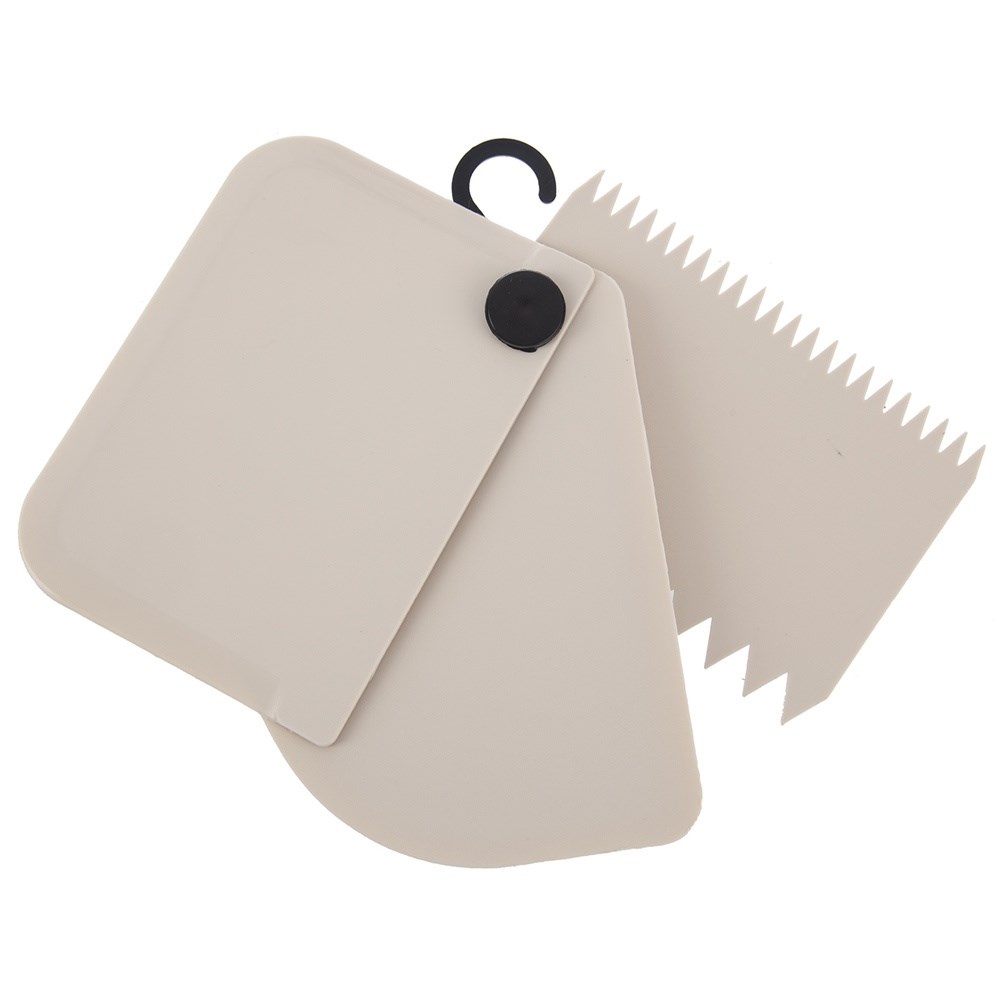 - A set of three confectionery spatula- A set of three confectionery spatulas ideal for various applications in the kitchen while baking cakes and cakes. Perfect for spreading masses, creams and creating decorative patterns on cakes and cakes. Includes a smooth spatula 12 x 8.5 cm, smooth rounded 13 x 9.5 cm, toothed spatula 11.5 x 8 cm.
