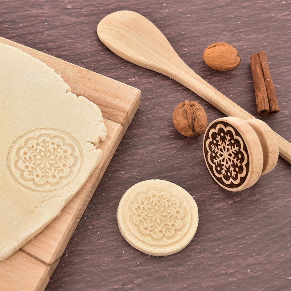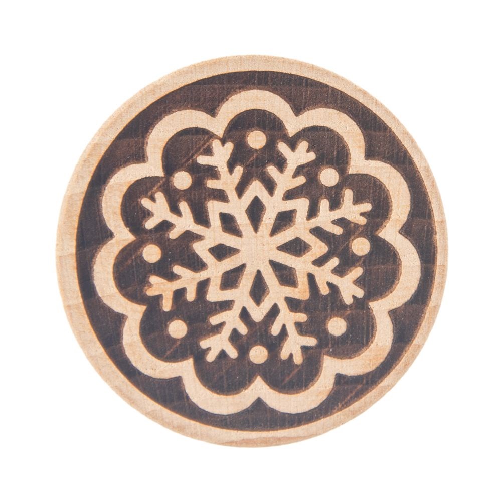 A wooden stamp with a snowflake pattern for decorating cookies and gingerbread. It lies comfortably in your hand. The diameter of the stamp is 5.5 cm.