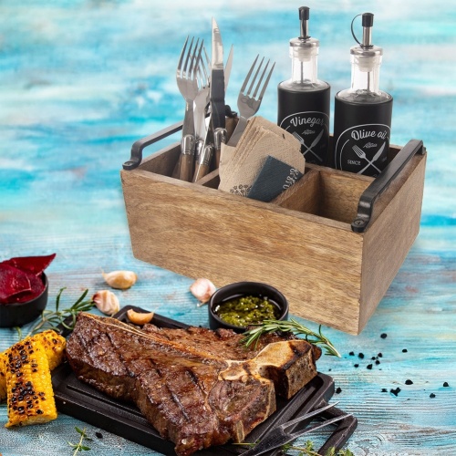 - PRACTICAL- a stand in the form of a practical cutlery box, sauces or spices. The container has 4 compartments - three smaller and one large. The container has dimensions of 25 x 19.5 x 10 cm. The height with handles is 13 cm.