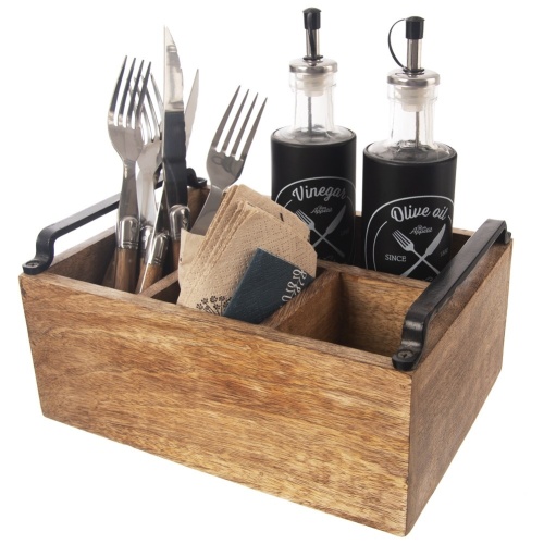 A container in the form of a box with 4 compartments. Solidly made of mango wood. We will use it to store cutlery, but also sauces or spices.
