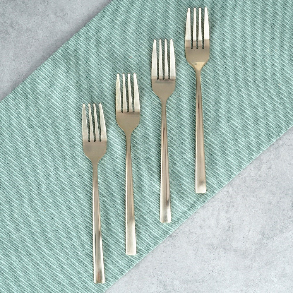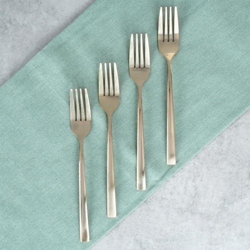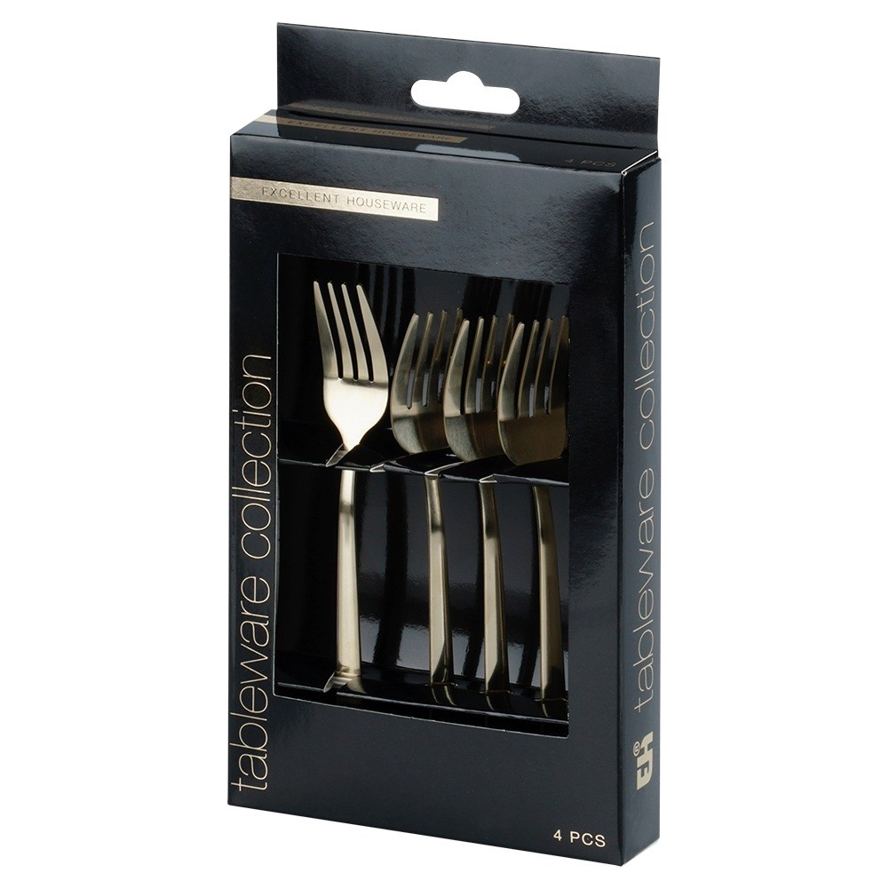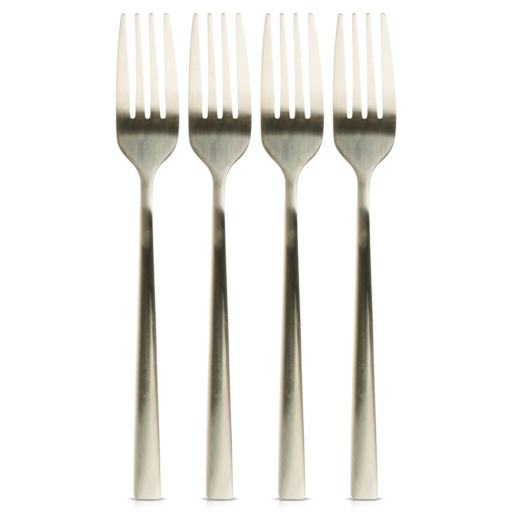 A set of four forks made of golden stainless steel. They will be great with classic and modern tableware.