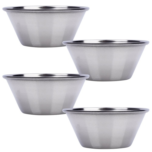 A set of four small bowls for serving sauces, dips, small snacks, etc. Made of silver stainless steel.