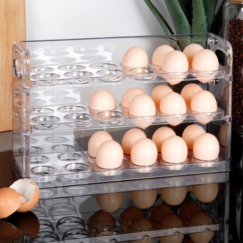 Organizer for storing 36 eggs in the fridge at three different levels. Made of plastic in a transparent color. It is possible to place it on the fridge door.