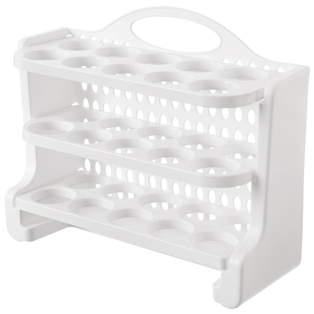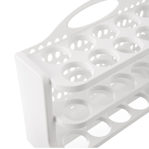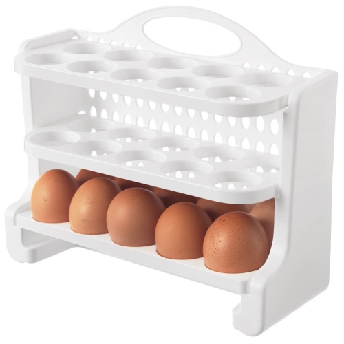 Organizer for storing 30 eggs in the fridge at three different levels. Made of plastic in white. It is possible to place it on the fridge door.
