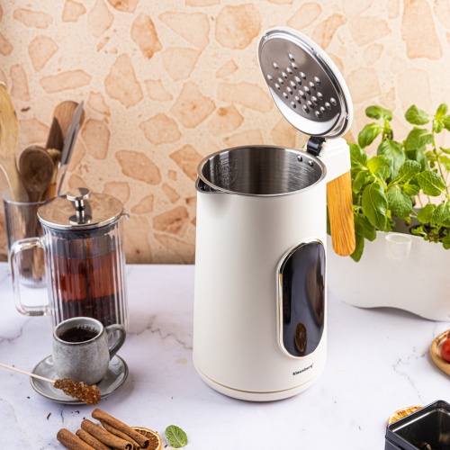 The cream-coloured exterior, combined with metallic details and the wood-look handle, makes the kettle blend in perfectly with modern, classic and Scandinavian kitchens. It is an appliance that serves both a practical and decorative function.