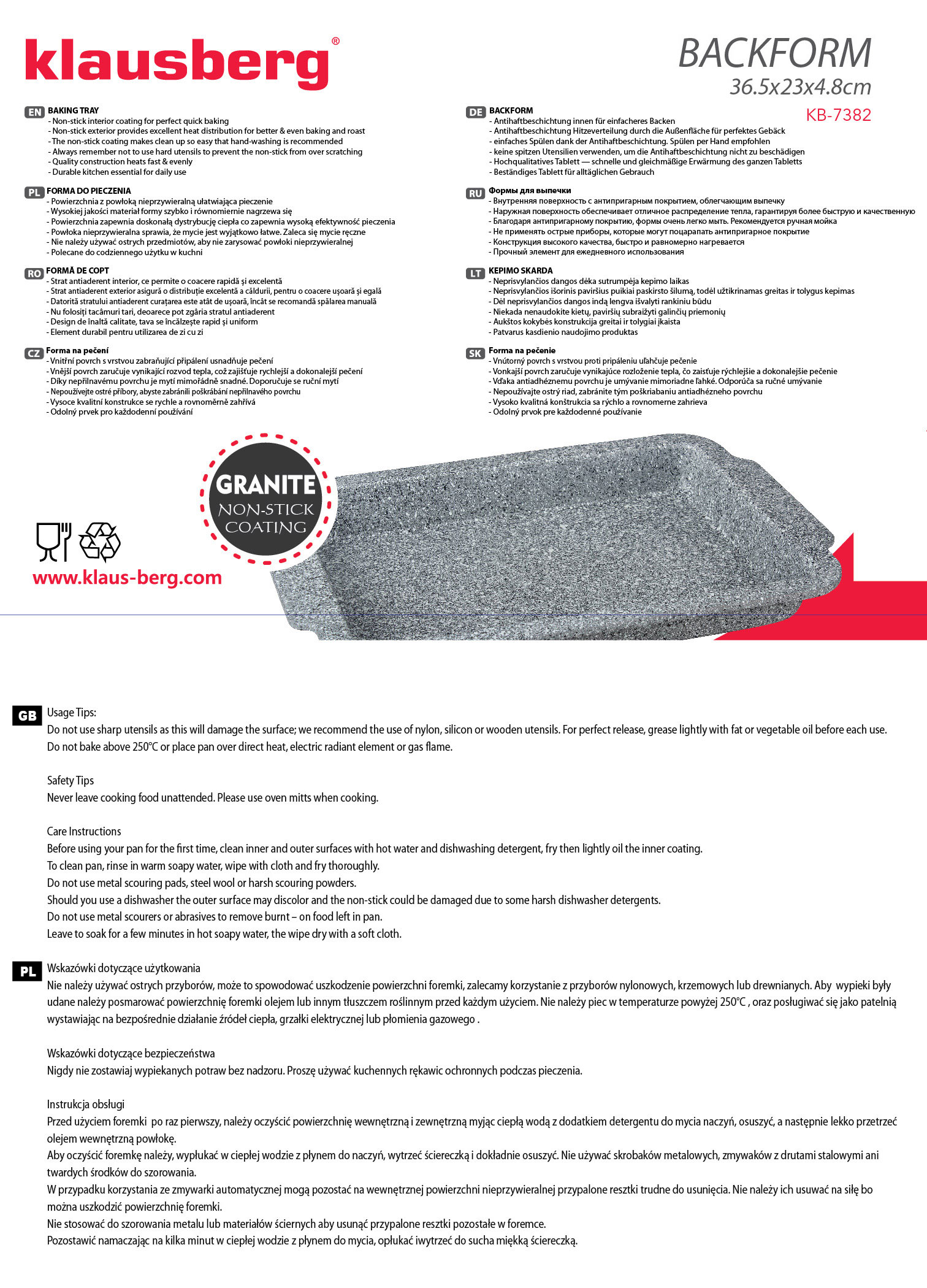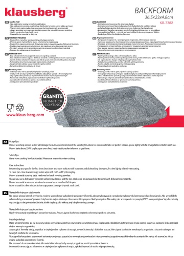 Forma prostokątna do pieczenia ciasta 36.5 x 23 x 4.8 cm cm firmy KLAUSBERG. Wykonana z blachy stalowej, pokryta nie przywierającą powłoką granitową GRANITE COATING w kolorze szarym.