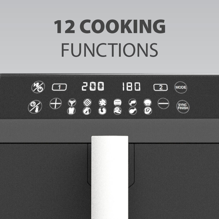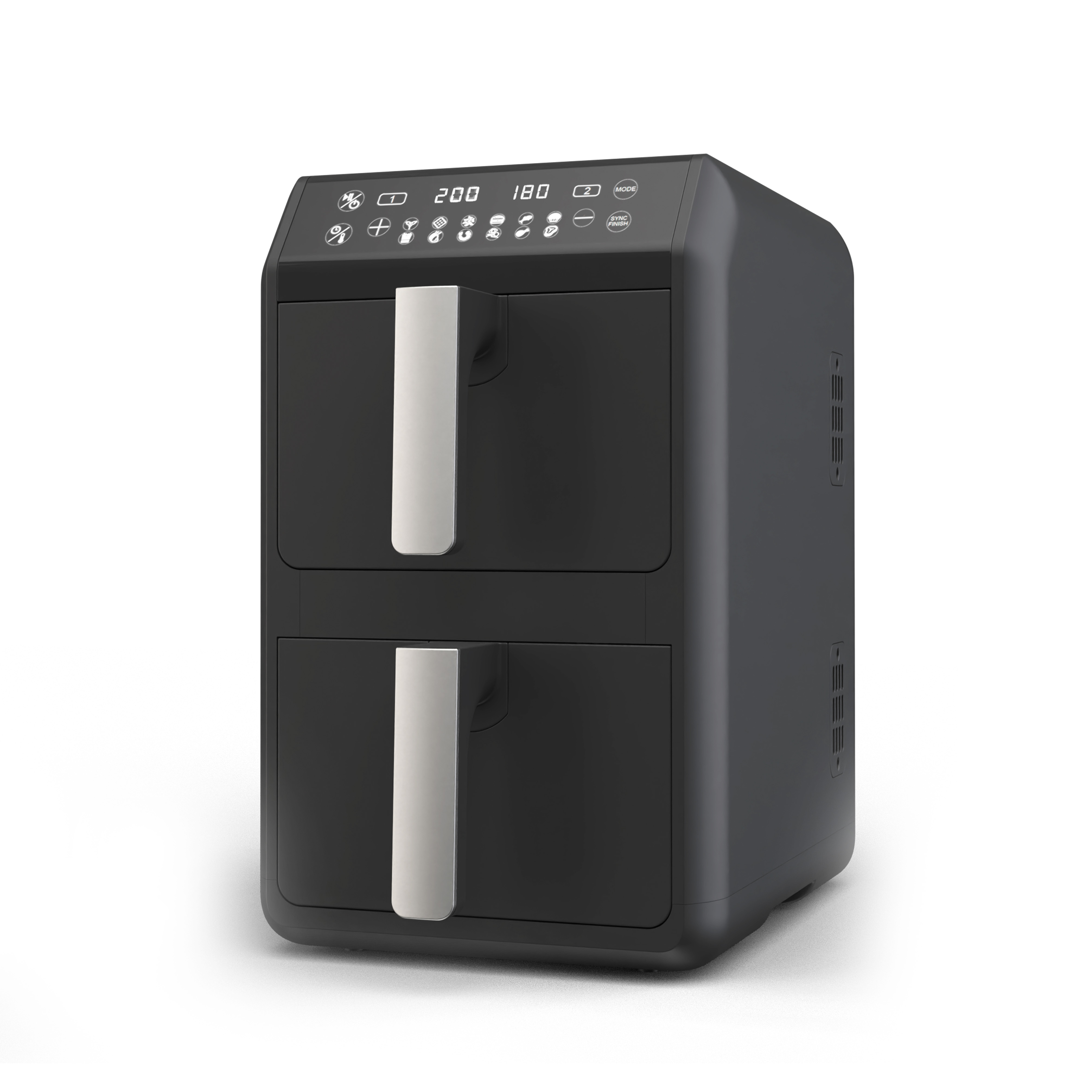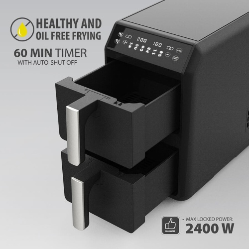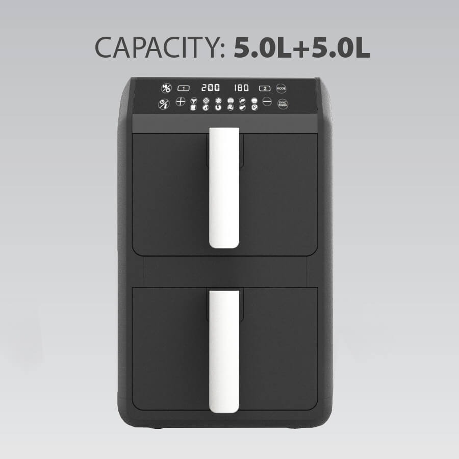 The MR-761 model is equipped withtwo independent chambers, each of which has a capacity5 liters. This allows you to prepare different dishes in parallel - e.g. chicken in one compartment and vegetables or fries in the other. Two individual control systems allow you to set a separate temperature and time for each basket.