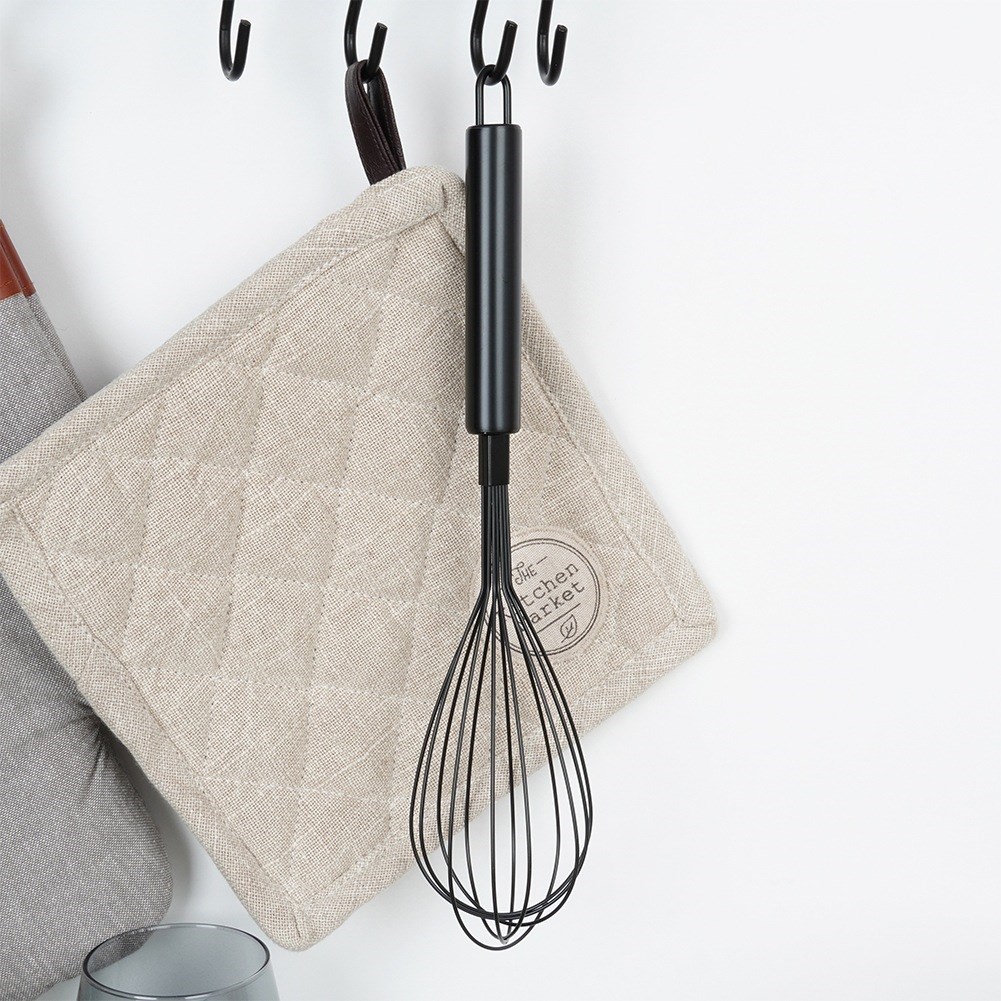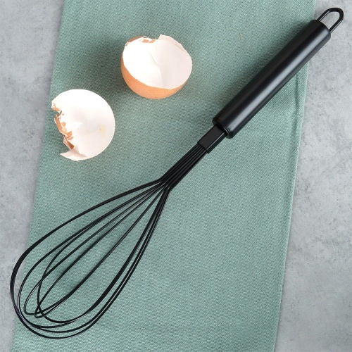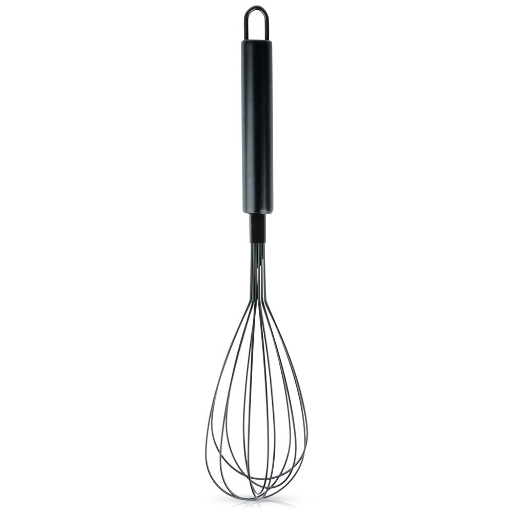 Kitchen whisk for whipping eggs, mixing dough or sauce. Made of stainless steel painted in black.