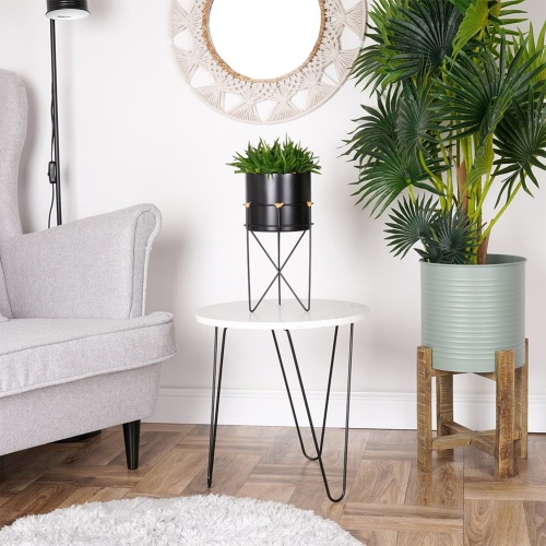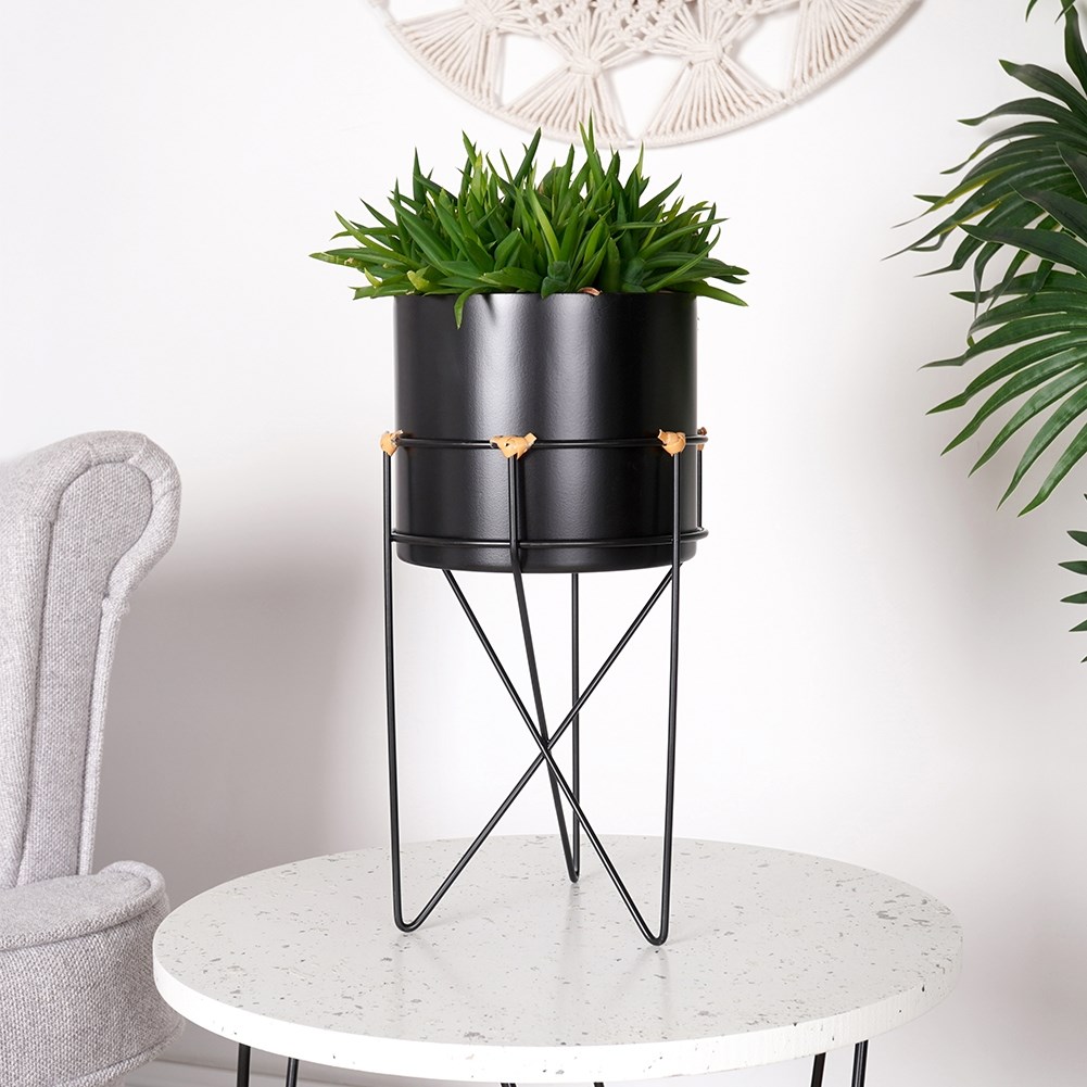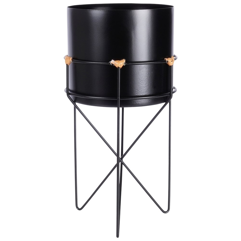 A black metal flowerpot cover placed on a black stand. Thanks to it, we can effectively display our favorite live or artificial plants.