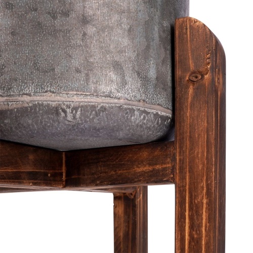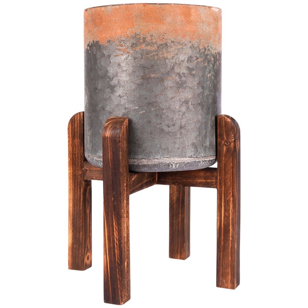 A flower stand in the form of a flower pot cover on a wooden stand. The cover is made of silver-colored steel with a rust effect. Decorated in a vintage style.