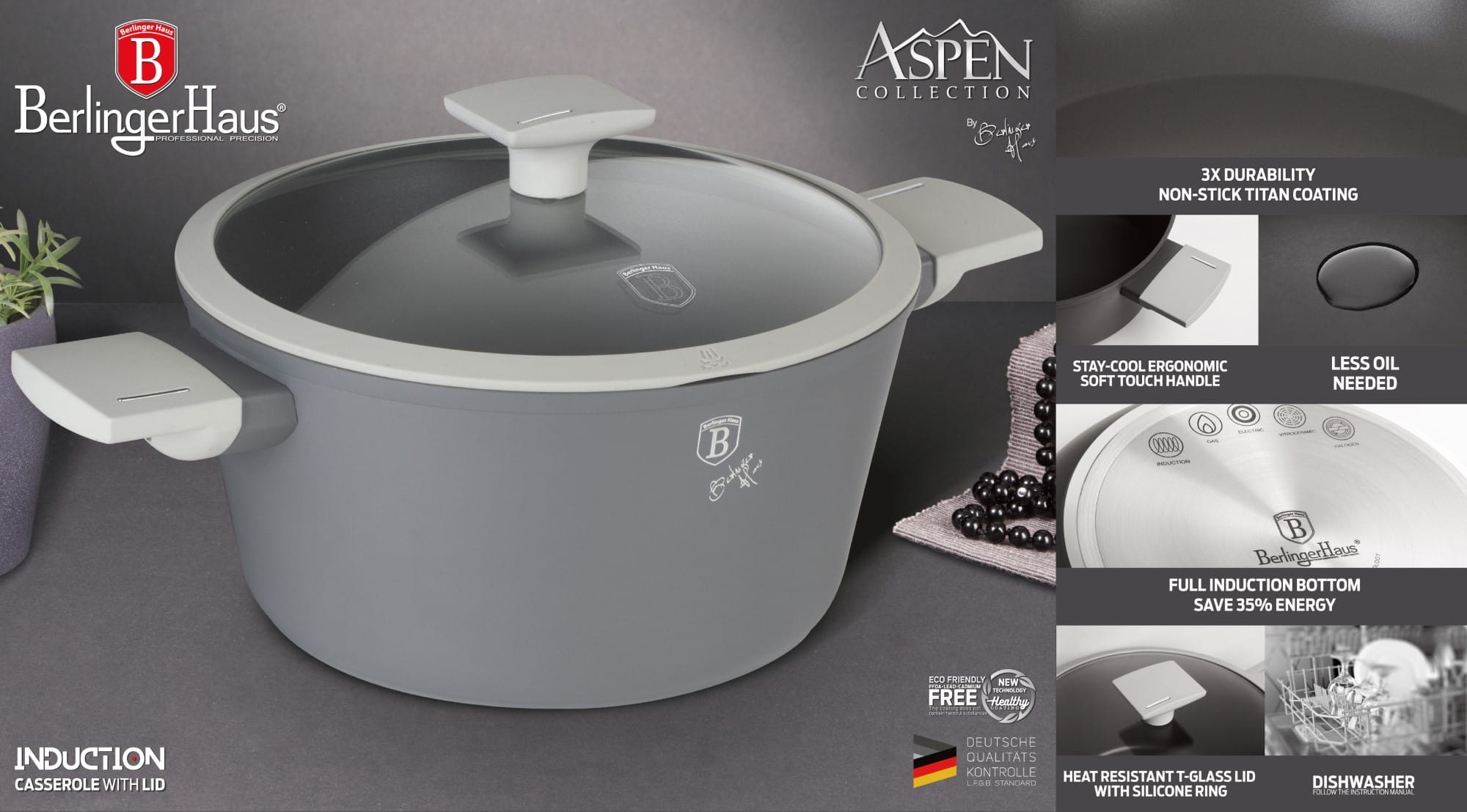 Garnki i patelnie ASPEN marki BERLINGER HAUS wykonane są z wysokiej klasy kutego aluminium pokrytego wewnątrz potrójną powłoką tytanową o bardzo wysokim współczynniku twardości. Produkty z serii ASPEN wyróżniają się szarym kolorem o modnym pastelowym odcieniu oraz nowoczesnym, w pełni indukcyjnym dnem. Te atrakcyjne naczynia wyposażone są standardowo w uchwyty typu SOFT TOUCH. Naczynia są przystosowane do wszystkich rodzajów kuchenek: gazowa, elektryczna, ceramiczna, halogenowa, indukcyjna. System TURBO INDUCTION (nagrzewają się bardzo szybko) pozwala zaoszczędzić nawet do 35% energii.
