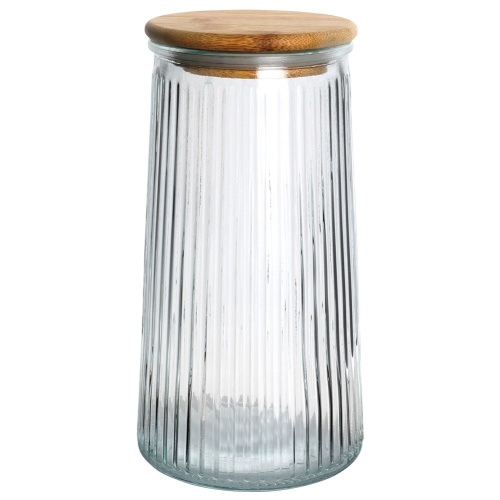 - RELIABLE- a container made of thick glass, which has a grooved surface, thanks to which it looks extremely impressive. Lid made of bamboo wood. The transparent glass will allow us to easily check the contents of the container.
