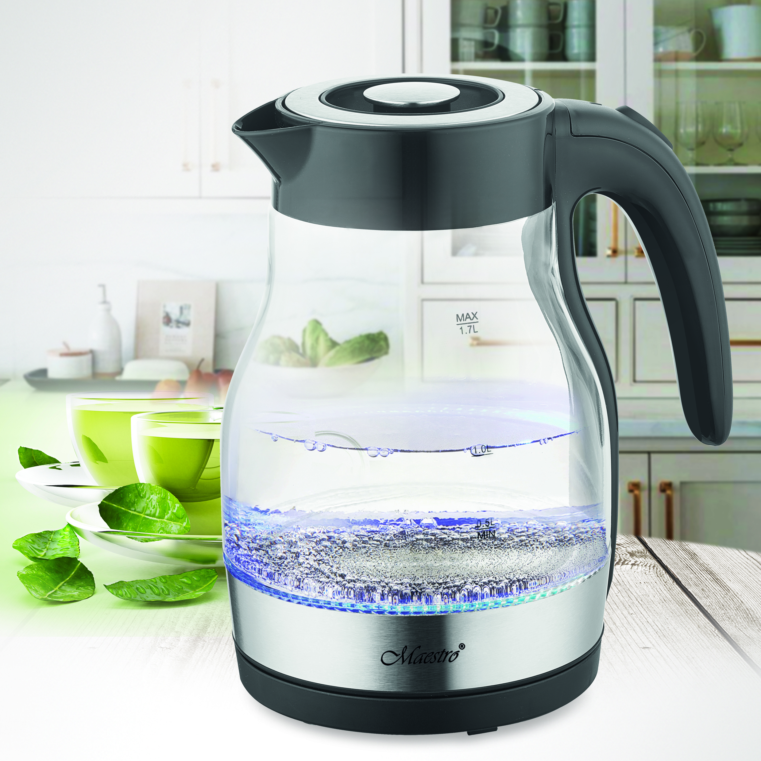 We present the Maestro glass electric kettle, which was designed with comfort and elegance in mind. Made of a combination of glass, plastic and stainless steel, it guarantees durability and resistance to damage.
