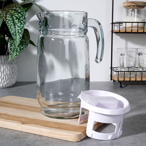 A universal jug with a drink lid. Ideally suited to water, serving juices, lemonade, frozen tea, compote, etc. made of glass.