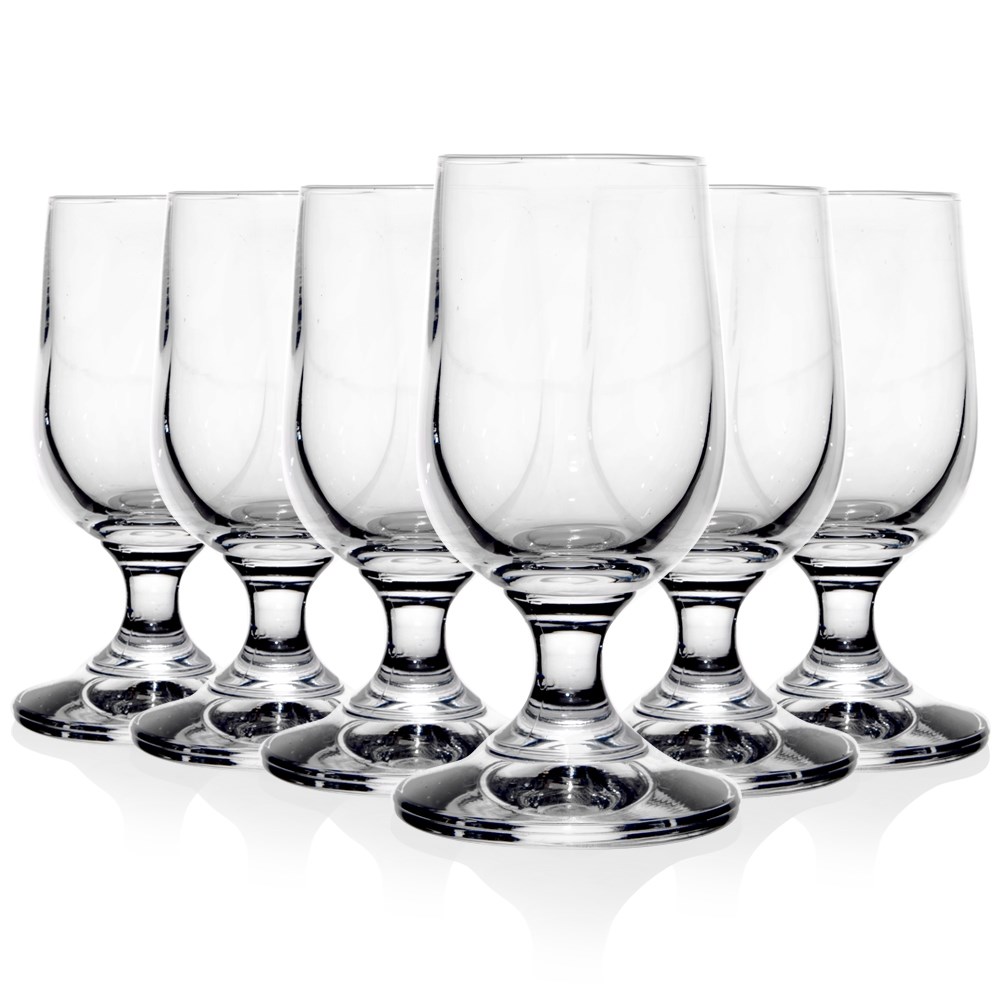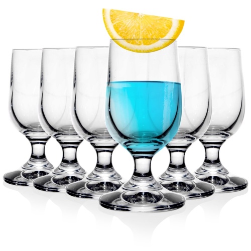 - PRACTICAL- Set of six stemmed glasses. Each glass has a capacity of 20 ml and dimensions of 8.5 x 3 cm.