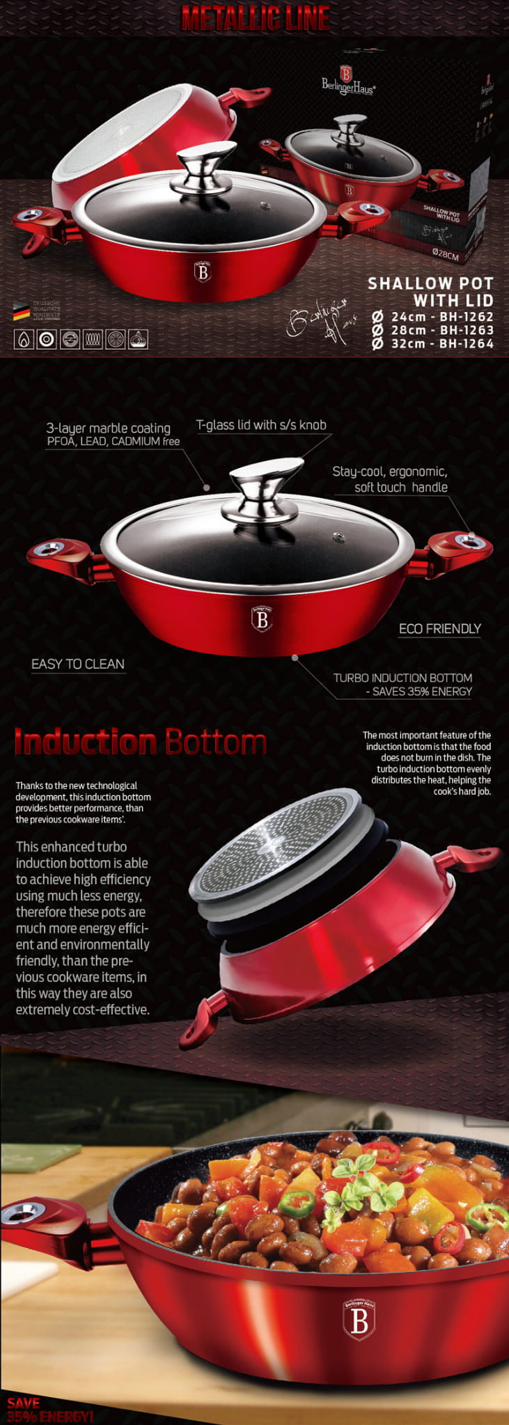 Pots and accessories from the METALLIC series by BERLINGER HAUS are made of high-class forged aluminium covered inside with triple granite (marble) coating with a very high hardness factor. The outer coating is available in several colour versions with a characteristic metallic gloss. These attractive and fashionable dishes are equipped with SOFT TOUCH (silicone handle) as standard. They are suitable for all types of cookers: gas, electric, ceramic, halogen, induction. TURBO INDUCTION system (they heat up very quickly) saves up to 35% of energy.