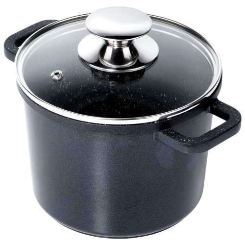 - TALL- Pot with a diameter of 17 cm and a capacity of 2 liters with a lid. The pot is made of black aluminum with a non-stick granite coating inside. Equipped with a lid made of glass and stainless steel. External dimensions of the pot: 24 x 17 x 12.5 cm, height with lid is 17 cm.