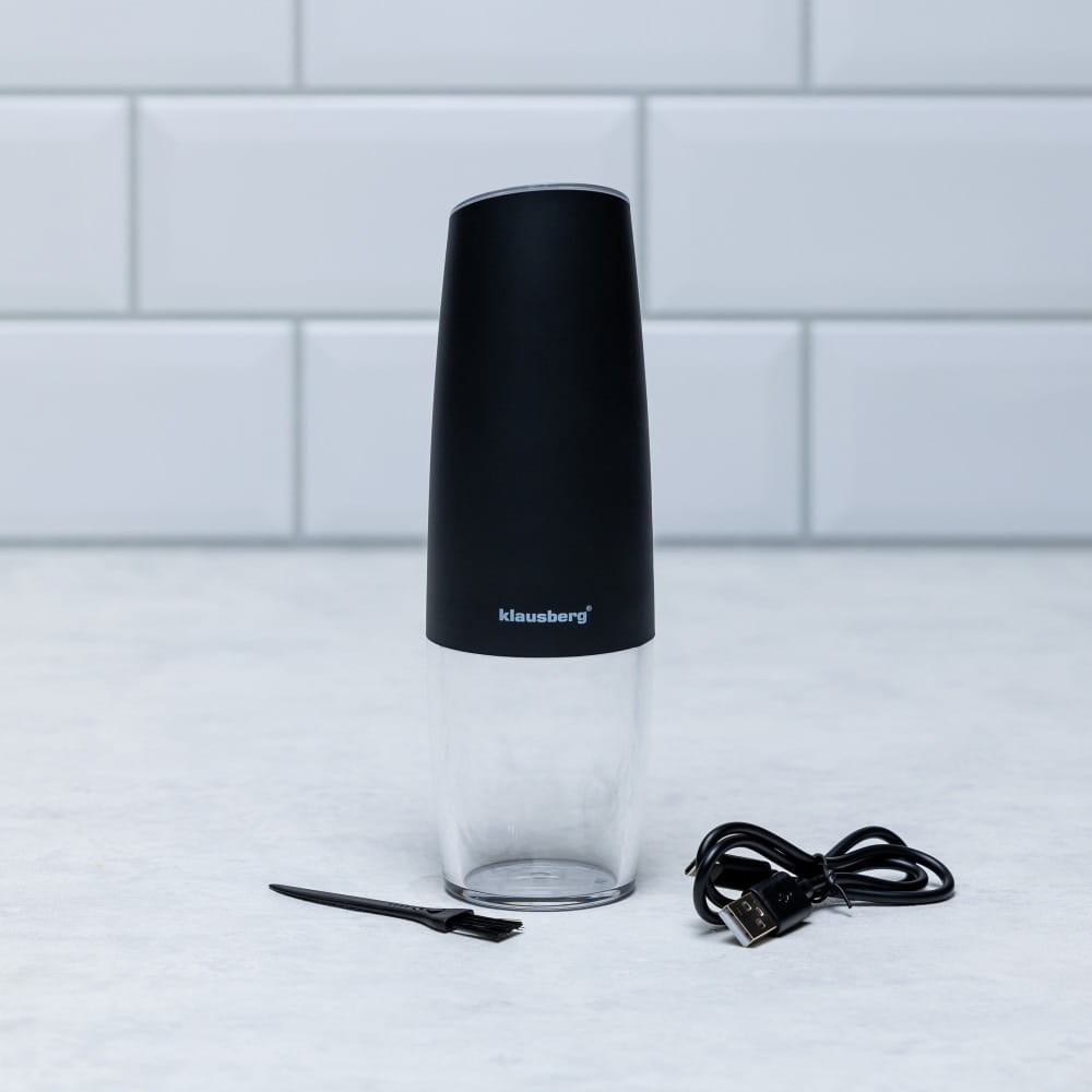 Gravity battery electric salt or pepper mill from the company KLAUSBERG. Very easy to use! Just turn the grinder upside down and it will automatically start working, tilt and stop grinding.Made of non-slip plastic in matte black. Housing with a window indicating the level of grain content. An efficient engine that easily copes with any type of pepper or salt. Corrosion-resistant ceramic mechanism for
