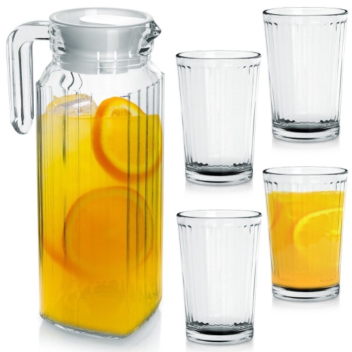 A set consisting of four glasses and a jug with a lid. An ideal set for preparing and serving drinks, juices, lemonade and water. The set is great when spending time in the garden, because the jug is equipped with a lid that will protect our drink from insects. Manufactured in accordance with European standards.