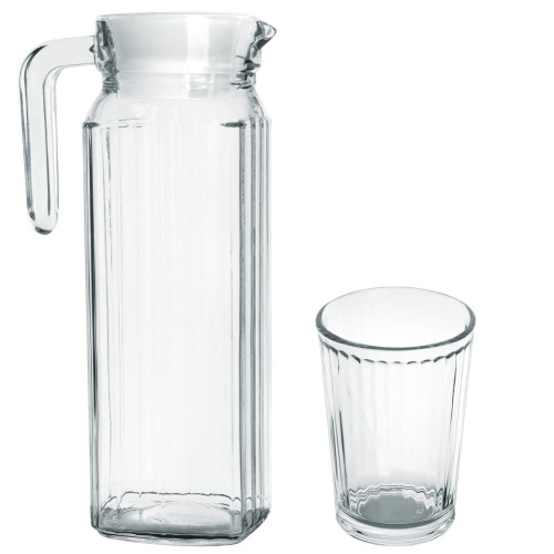 - The perfect set- A set consisting of a jug with a lid and four glasses. Each glass has dimensions of 6.5 x 10 cm and a capacity of 190 ml. The jug has dimensions of 12 x 8.5 x 24.5 cm and a capacity of 1.1 l.