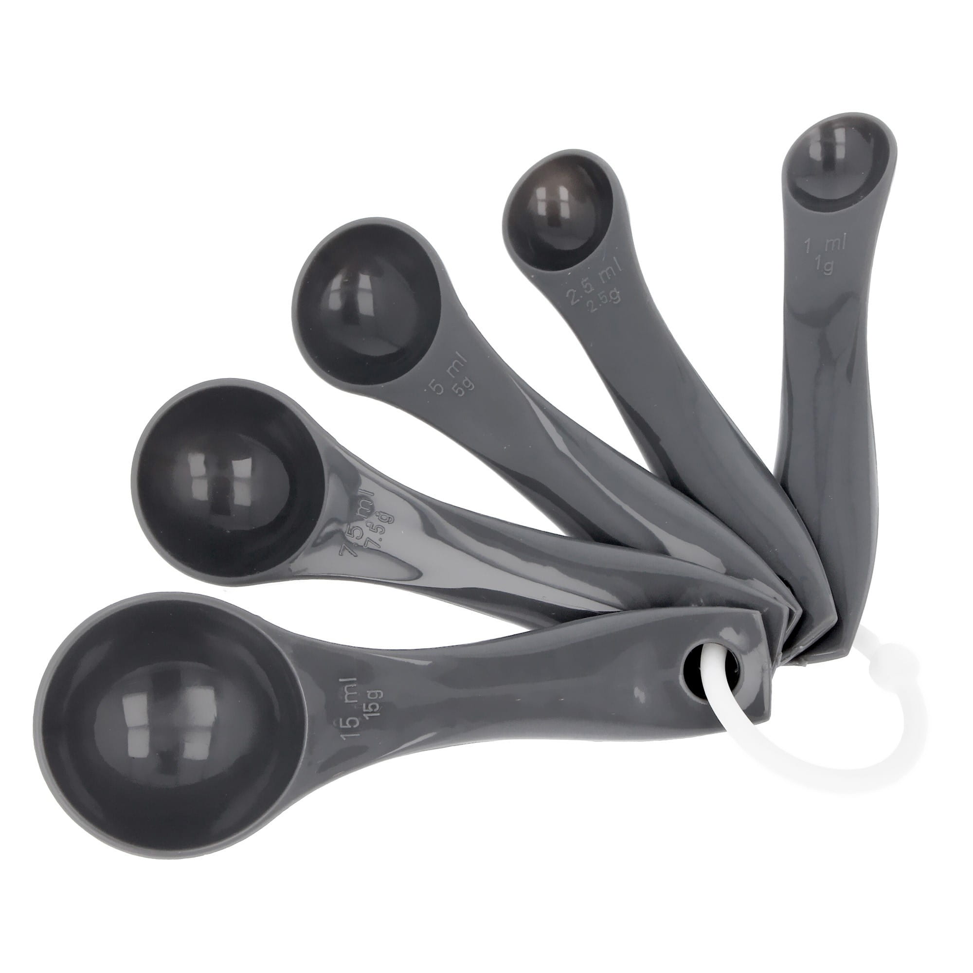 - Set includes 5 spoons of different capacities, the spoons are attached to a common ring that can be separated