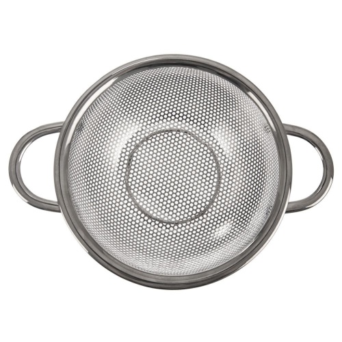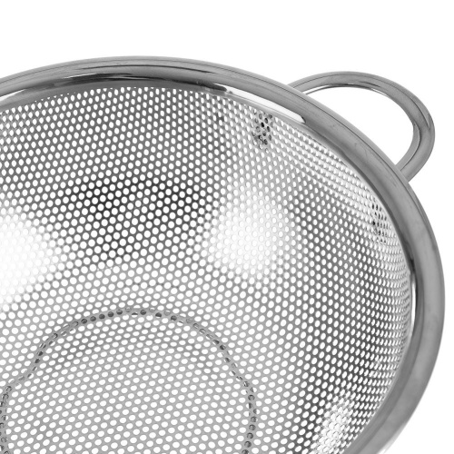 Universal kitchen strainer in the form of a bowl. Made of stainless steel. It has two handles and legs that will ensure stabilization. It works for straining, washing and rinsing products.