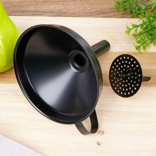 Practical pouring funnel equipped with a strainer. Made of high quality black stainless steel. Ideal for pouring drinks, e.g. juices, tinctures, wine.