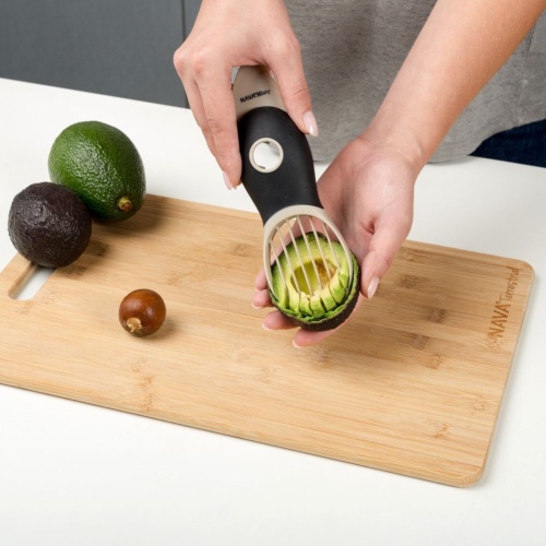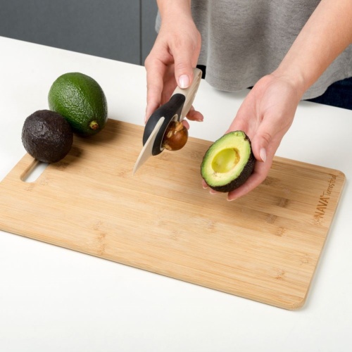 The 3in1 avocado knife makes it easier to prepare and serve avocado. It makes cutting and peeling avocado easy and fast. It has three knives for various tasks - a knife for pushing and peeling avocado, a knife for removing stones, as well as a knife for cutting fruit into slices. Perfect for preparing salads or toast. An essential device for every lovers of this fruit.Original product of the Greek Nava brand from Misty kitchen utensils.Manufactured in accordance with European standards.