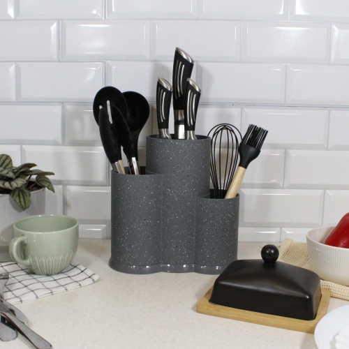 The Brunbeste knife stand is the perfect solution for people who value order and elegance in the kitchen. Made of durable material with a modern, marble finish, it not only looks great on the countertop, but also guarantees long-term use. Thanks to three practical compartments, you can conveniently store both knives and other kitchen accessories - spoons, whisks and tongs.