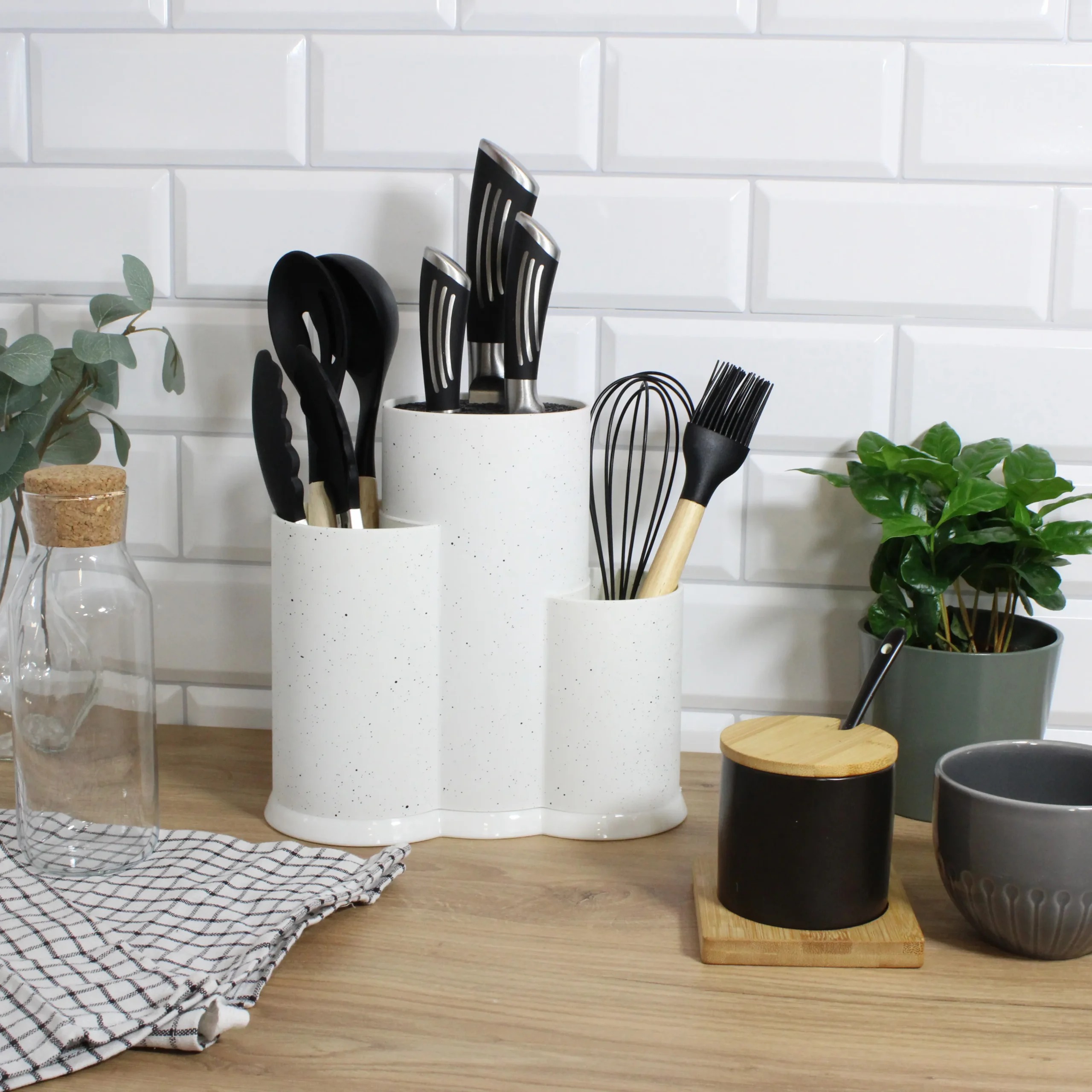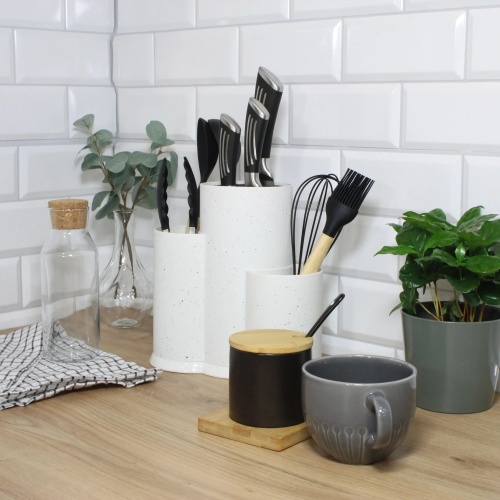 The Brunbeste knife stand is the perfect solution for people who value order and elegance in the kitchen. Made of durable material with a modern, marble finish, it not only looks great on the countertop, but also guarantees long-term use. Thanks to three practical compartments, you can conveniently store both knives and other kitchen accessories - spoons, whisks and tongs.