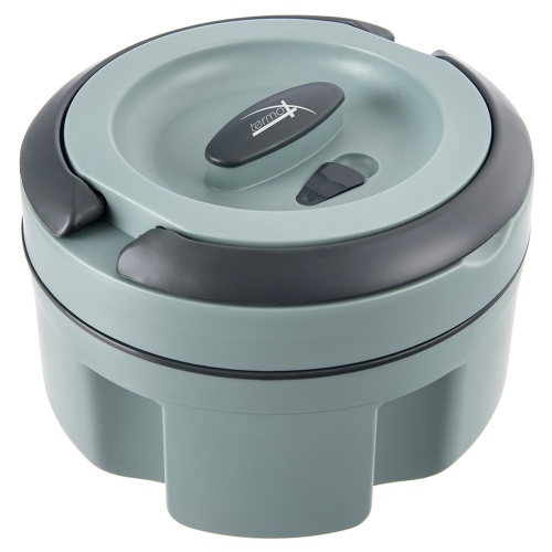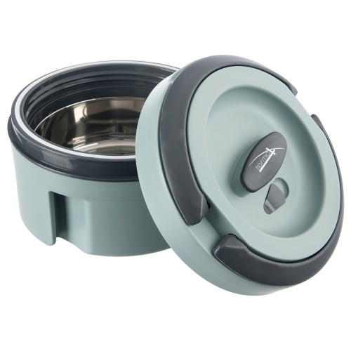 Dinner thermos with a seal and valve to keep food warm. In the summer it will be perfect for storing ice cream. Made of plastic outside, stainless steel inside.