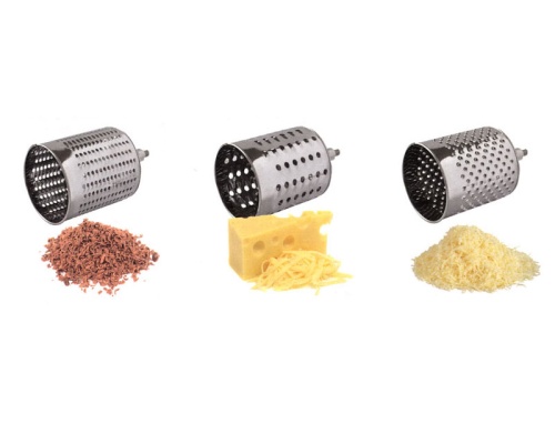 - Posiada 3 wymienne bębnowe tarcze tnące do różnego rodzaju produktów