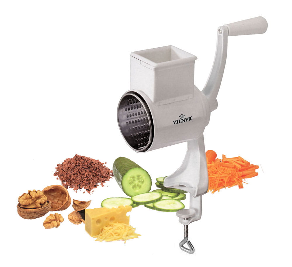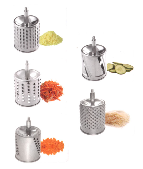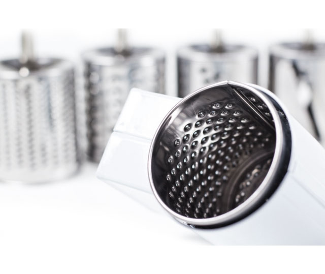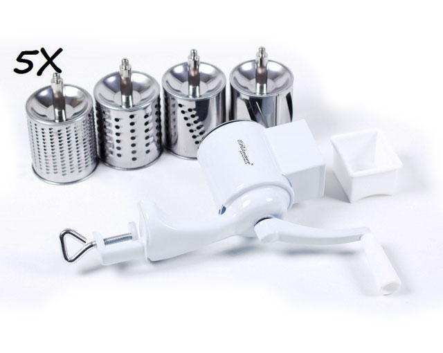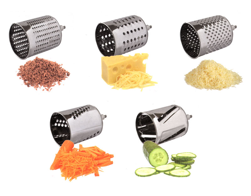- Posiada 5 wymiennych bębnowych tarcz tnących do różnego rodzaju produktów