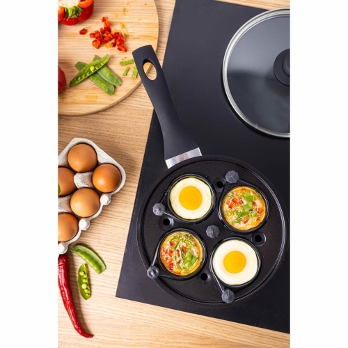 A frying pan with an additional insert for frying eggs with a diameter of 20 cm by KINGHOFF made of stainless steel with a marble non-stick coating. The practical recesses finished with non-stick coating are easy to clean and allow you to easily fry eggs with little fat or cook shirred eggs. When the insert is removed, the pan performs its traditional function.