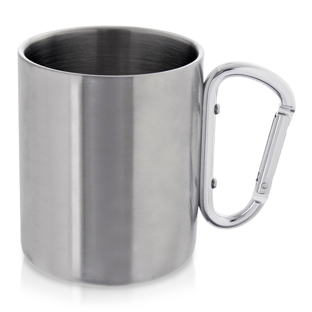 A steel mug with a handle in the form of a carabiner. Extremely durable and convenient to use. It works at a campsite or during mountain hiking.
