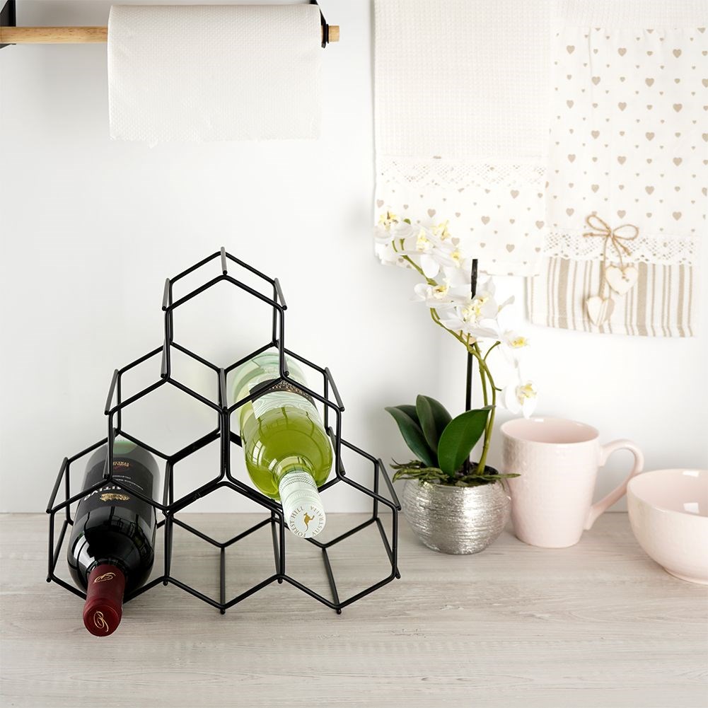 Wine rack made of black metal. It can hold 6 bottles of your favorite drink. The stand can stand both on the floor and on the countertop.