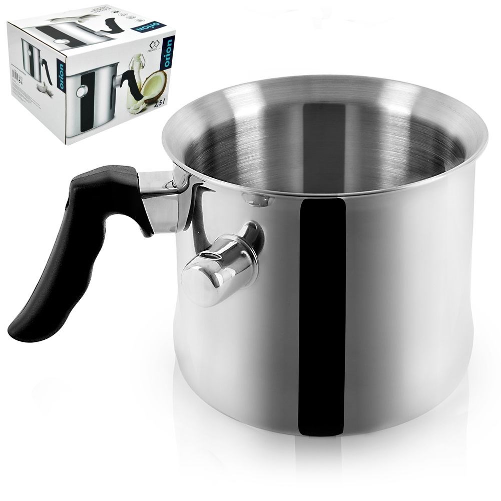 A pot for heating milk with a comfortable handle and a water jacket. Extremely solidly made of the highest quality materials. Easy to clean. It accumulates and distributes heat well. Thanks to its universal use, it is also perfect for preparing sauces, puddings or perfectly melting chocolate for desserts. Useful in every home.Original product of the Czech brand Orion.Manufactured in accordance with European standards.
