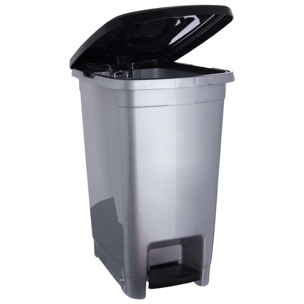 Practical, narrow waste bin, opened with a pedal. Made of durable gray plastic. It has handles to hold the garbage bag.