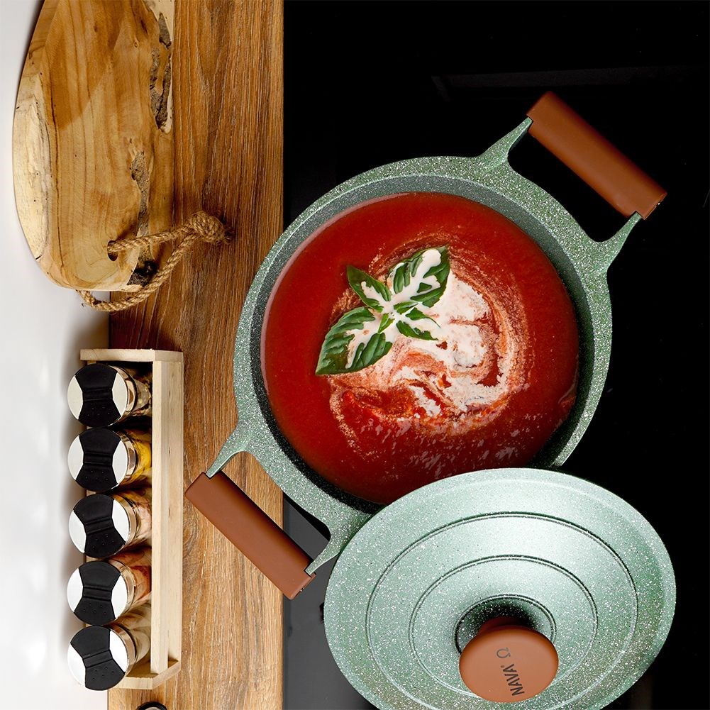 A non-stick pot with a unique, timeless look. The pot has a beautiful dark green color and brown inserts, which makes it look great in the kitchen. The pot is perfect for cooking and stewing, you can prepare various types of dishes, soups and sauces in it. It looks impressive in the kitchen and when serving dishes directly on the table.An original product of the Greek brand NAVA from the Omega cookware line.Manufactured in accordance with European standards.