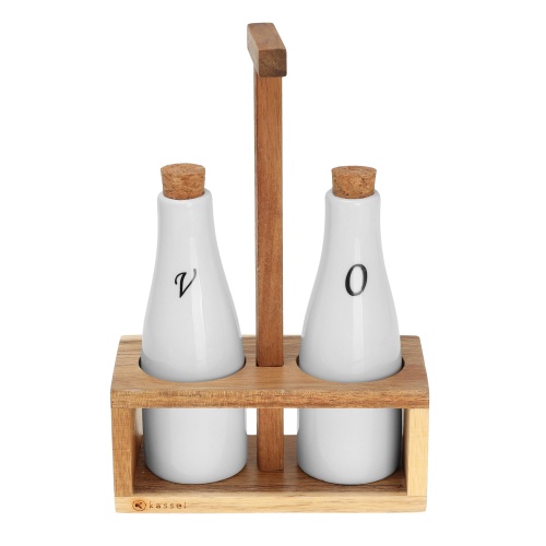 Przyprawnik na ocet i oliwę 2 w 1 KASSEL składający się z 2 porcelanowych butelek w kolorze białym w stojaczku z drewna akacjowego. Na butelki naniesione logo umożliwiające identyfikację zawartości. Butelki wyposażone w naturalne korki.
