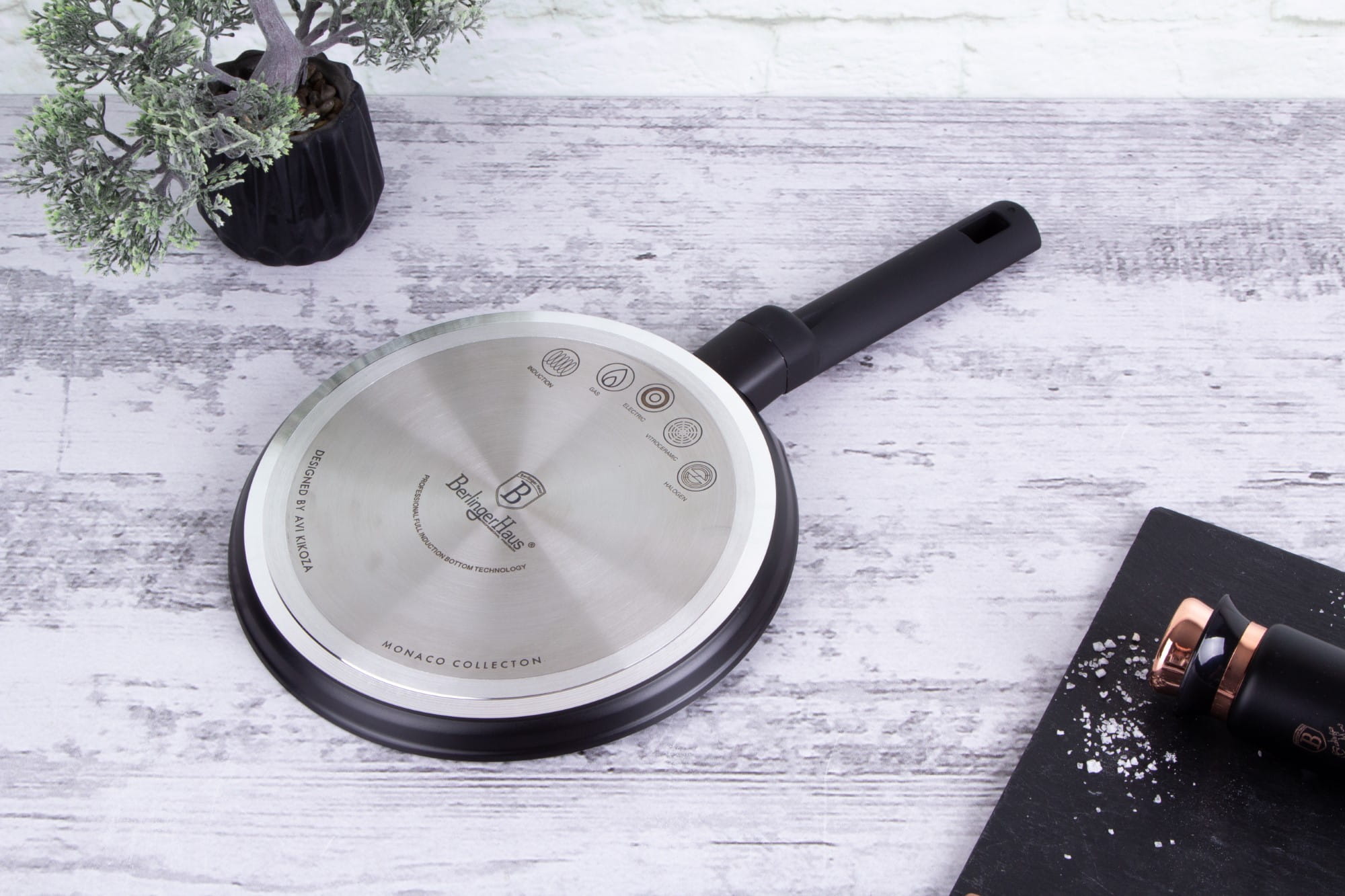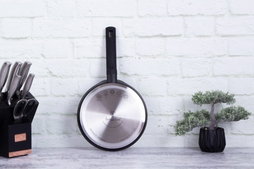 BERLINGER HAUS pancake pan with a diameter of 25cm from the BERLINGER HAUS MONACO series, dishes from this series are made from high-quality forged aluminium coated inside with titanium coating with a very high hardness coefficient. The outer coating in matt black. These attractive and fashionable cookware are equipped as standard with SOFT TOUCH handles (silicone grip) and are suitable for all types of cookers: gas, electric, ceramic, halogen, induction.
