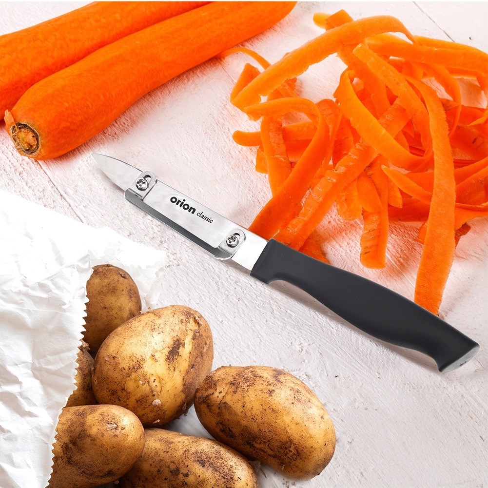 A small kitchen knife with mounted peeler on the blade with the possibility of dismantling. The knife is useful in every kitchen. It works for quick and easy peeling of cuticles, e.g. potatoes, apples or cucumbers. The knife has a sharp blade, thanks to which using it is very comfortable. Original product of the Czech brand ORION.Manufactured in accordance with European standards.