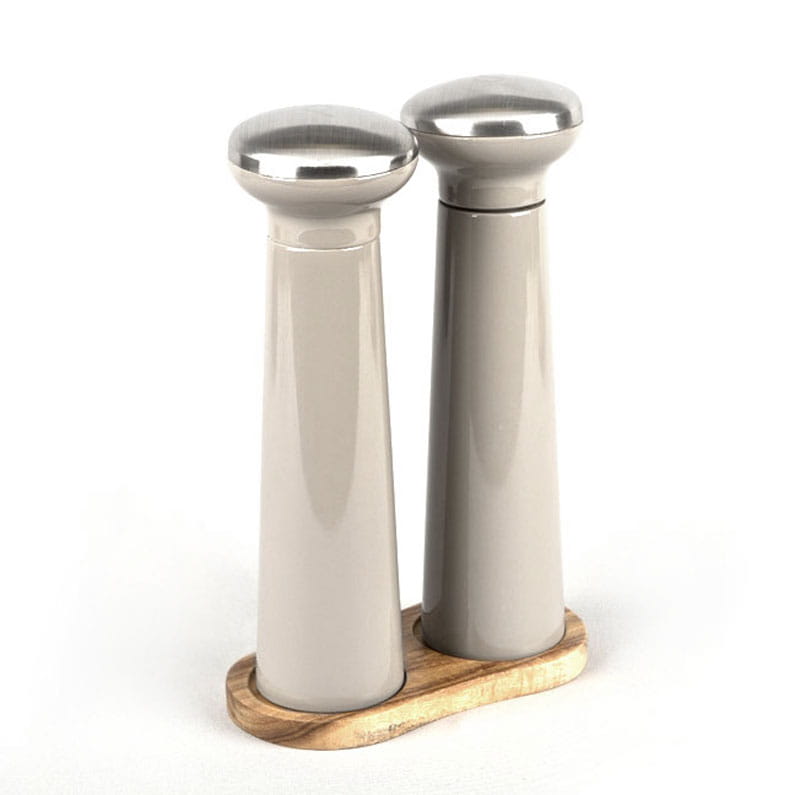 A set of KLAUSBERG pepper and salt mills made of wood lacquered in light grey / cappuccino.