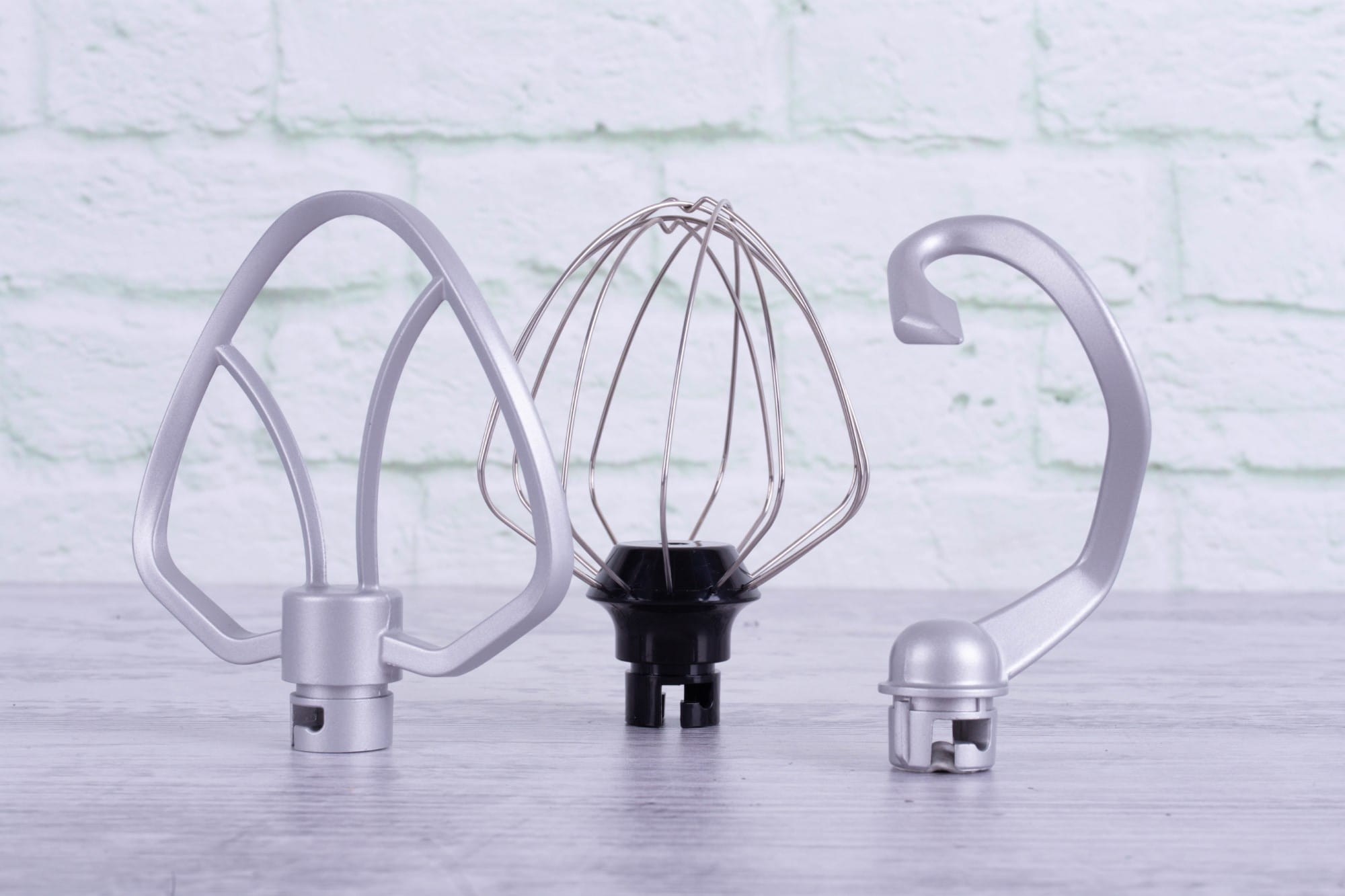 The stand mixer is equipped with three attachments, a wire whisk, a dough hook and a flat beater. The three attachments cater for all your mixing needs, including blending, whisking, kneading, mixing eggs or cream.