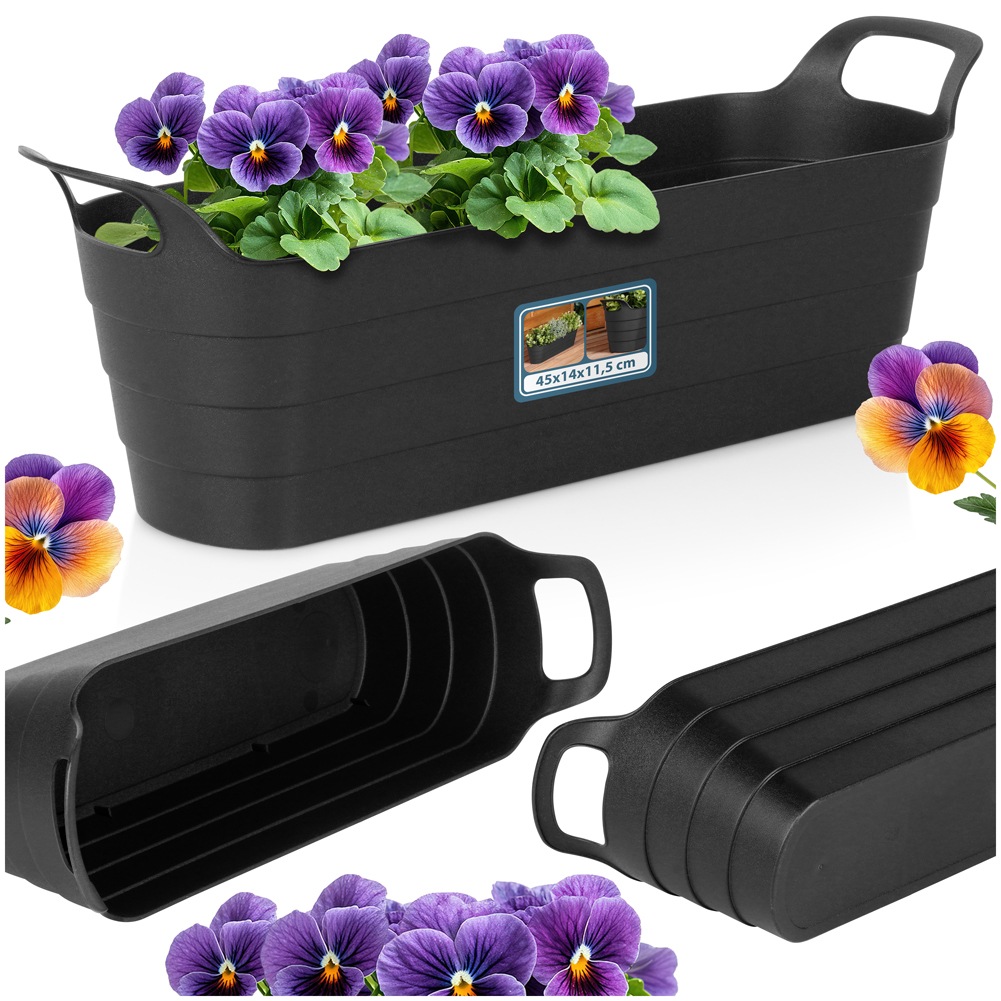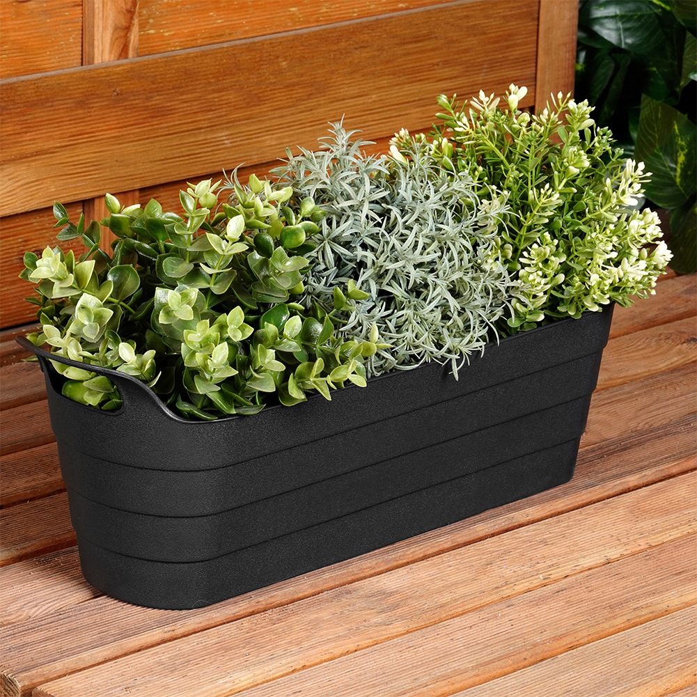Oblong black flowerpot. Perfect for planting herbs and flowers. The pot is 44.5 cm long and is resistant to weather conditions.