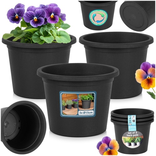 Set of 3 black flower pots. Perfect for planting herbs and flowers. The pots have a diameter of 14.5 cm and are resistant to weather conditions.
