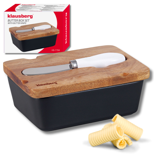 Porcelain butter dish from the KLAUSBERG brand in black with a lid made of acacia wood.