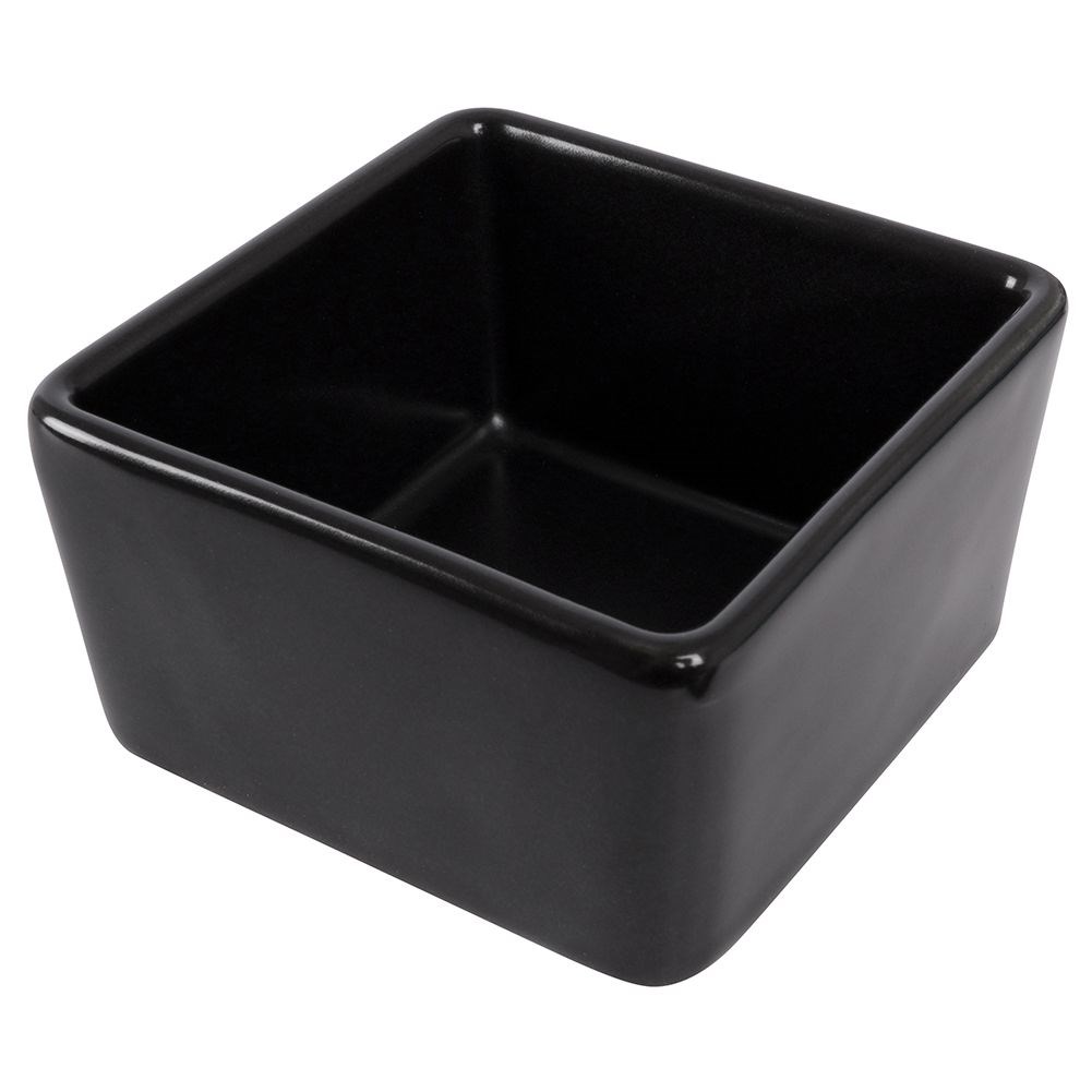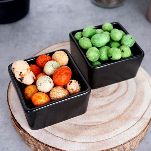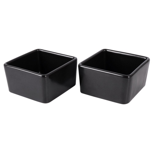 A set of two bowls for snacks or sauces. Solidly made in a fashionable black color, they perfectly match any tableware. The snacks or sauces served in them look very impressive. They have a classic shape and form that suits any table arrangement. We will use them both in everyday use and during parties. They are suitable for home and professional use. Manufactured in accordance with European standards.